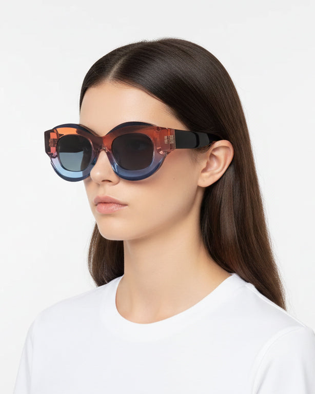 Turn heads with the BADDY round sunglasses, an oversized frame featuring sculptural acetate bevels that reveal a striking interplay of gradient color layers, perfectly blending bold attitude with timeless elegance. Handcrafted in Italy from premium acetate, BADDY delivers exceptional durability and comfort, while its high-quality lenses ensure optimal UV protection.