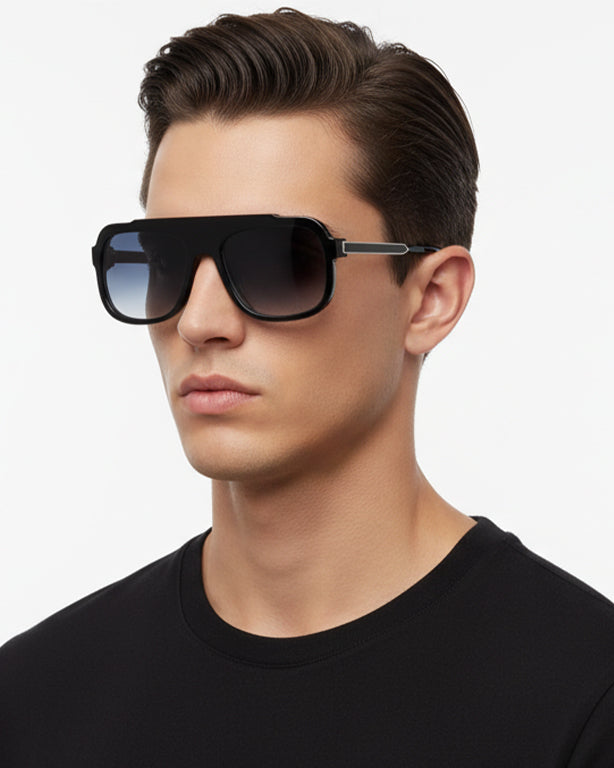 - Solid black & gradient grey lenses w/ silver & black lacquer metal temples