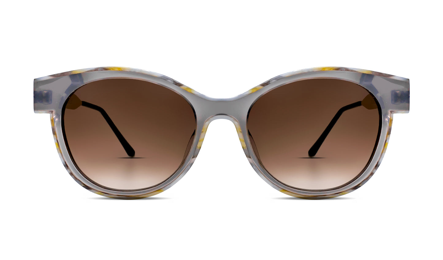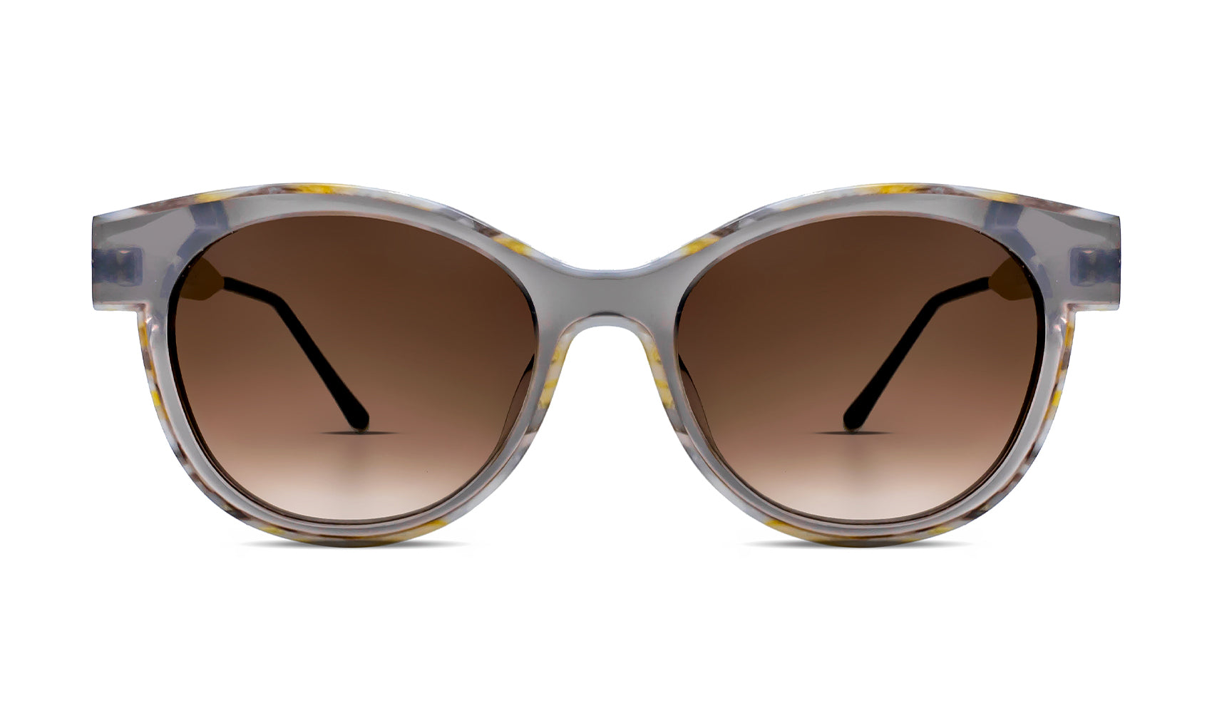- Translucent gray & yellow pattern acetate with gold temples and gradient brown lenses