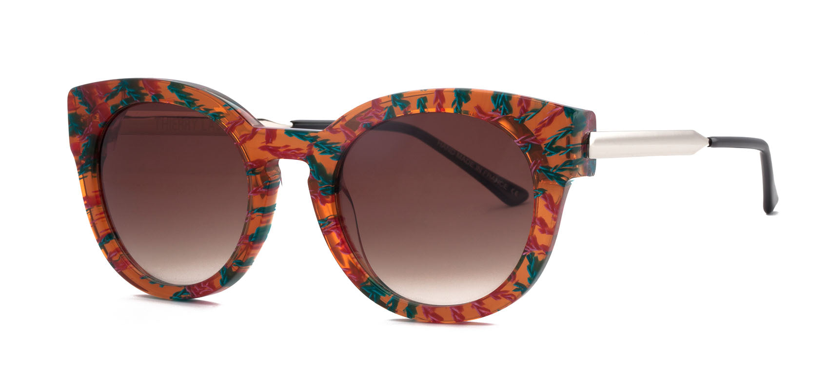 - Orange, blue, and purple pattern acetate with silver temples and gradient brown lenses