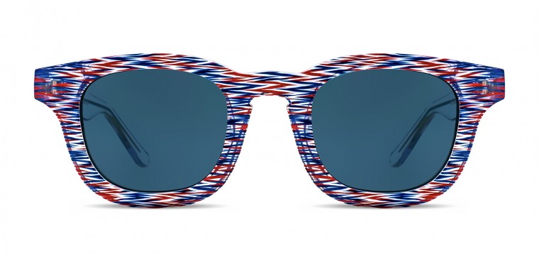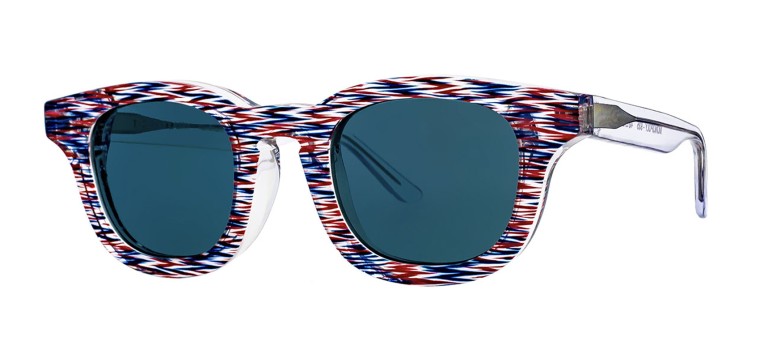 - Blue/red/clear stripes pattern acetate with solid navy blue lenses