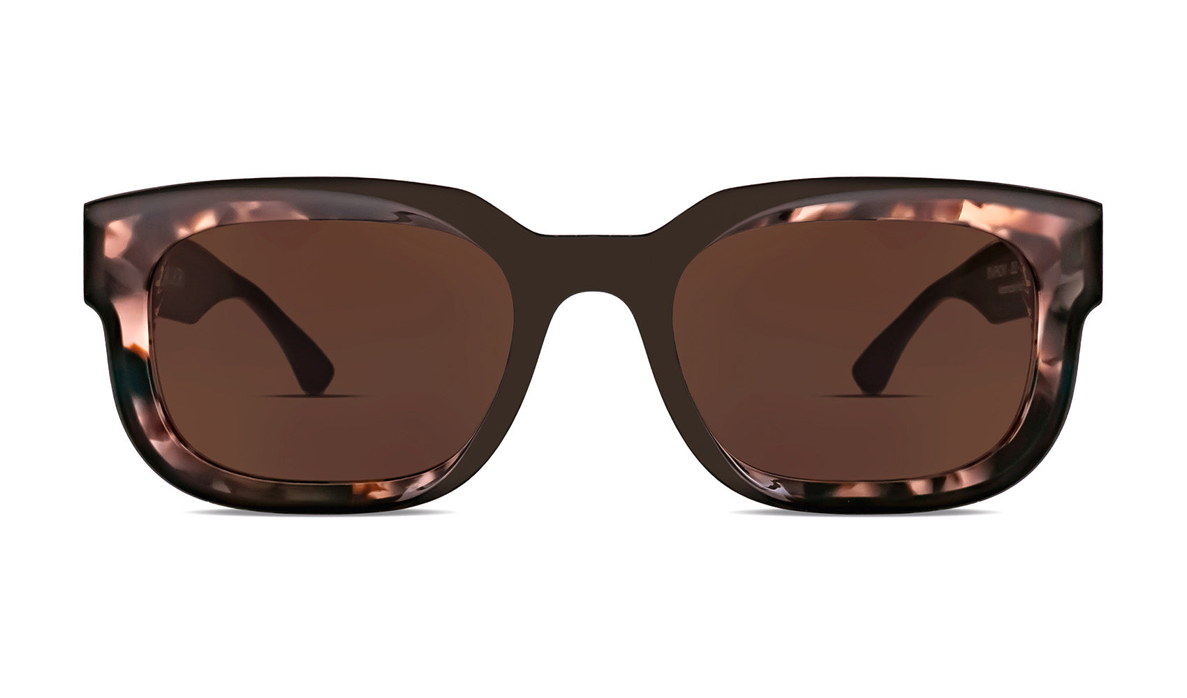• Solid brown & pink tortoiseshell w/ solid brown lenses